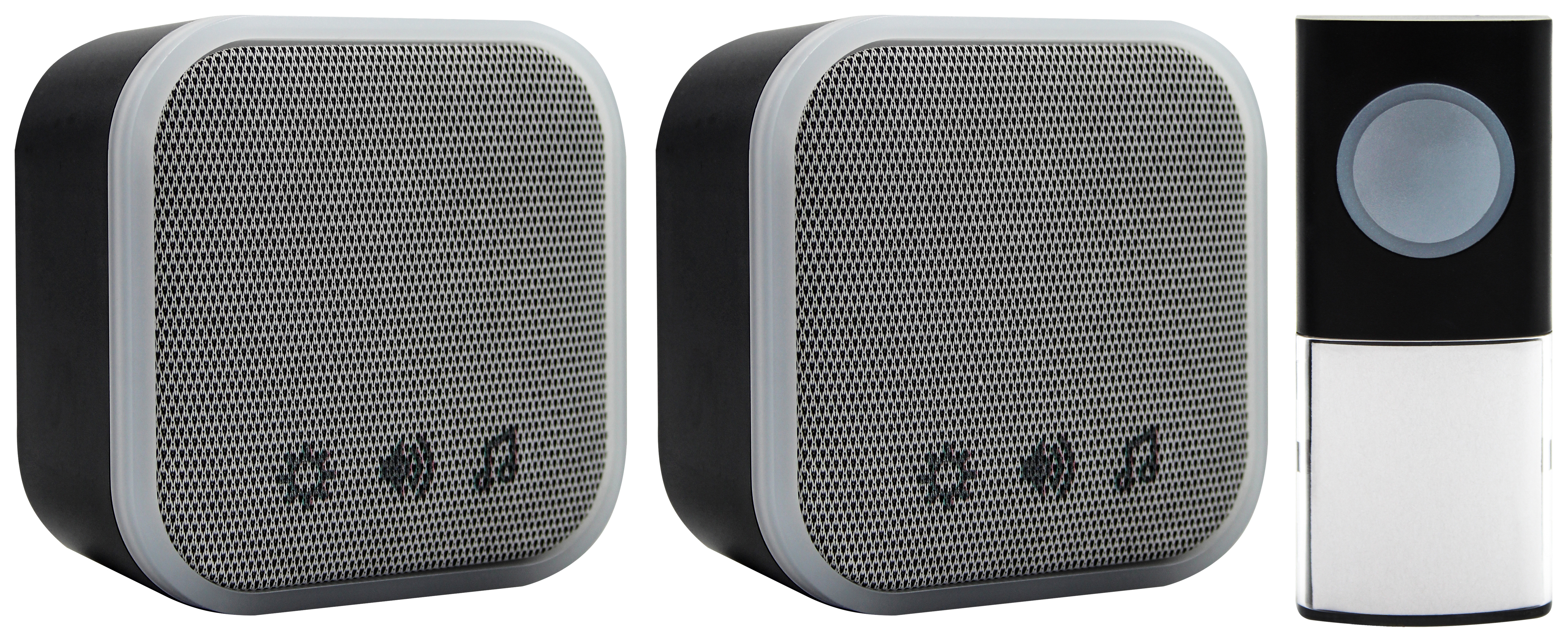 Uni-Com Portable and Plug-In Door Chime Set - Black - The Uni-Com Portable and Plug-In Door Chime Set is for use all around your home. The set extends your door chime system, so you can have the plug-in unit permanently in a hallway and the portable unit to take with you anywhere in the home or garden. The Door Chimes are wireless, so no wiring is required, and with an extensive operating range of up to 150m, you never have to miss a visitor or delivery. With 30 different chime melodies to choose from, 90dB(A) sound output with volume control and a flashing blue chime alert, you will always know when somebody is at your door.
