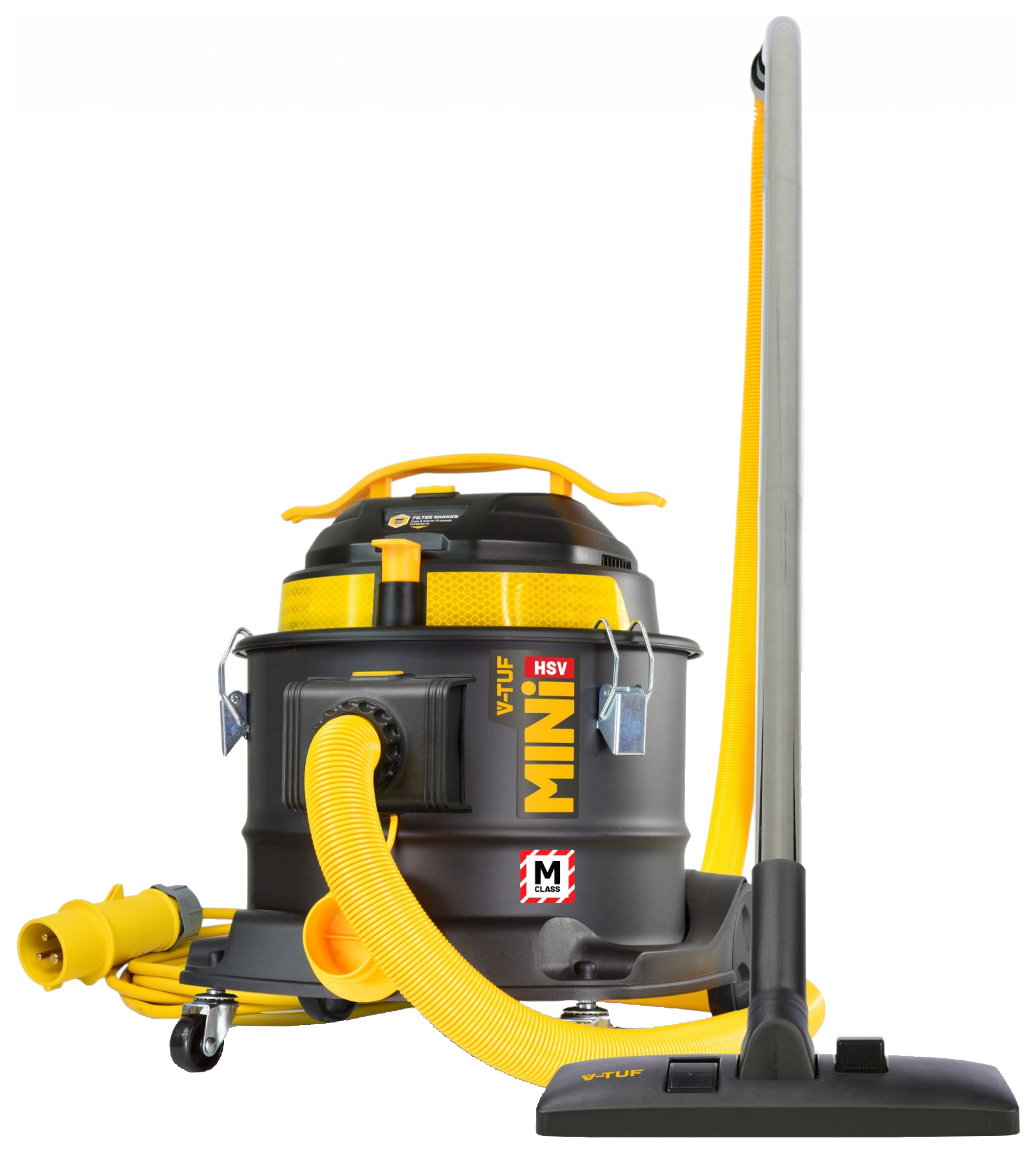 V-Tuf HSV X2 110V M-Class Mini Dust Extraction Vacuum Cleaner - 800W - The V-Tuf Mini Dust Extraction Vacuum Cleaner is a compact, lightweight M-Class dust extraction vacuum designed to provide affordable on-site health & safety compliance for tradespeople and contractors. Ideal for use with power tools, this 110V extractor delivers up to 99.9% filtration efficacy (H13 HEPA) to significantly reduce exposure to hazardous fine dust such as silica, wood and concrete particles. With its integrated filter shaker system, high-visibility hose and cable, and robust 15L tank, it is built for daily site use while remaining easy to transport and store. The extraction velocity monitor ensures consistent suction performance and ongoing M-Class compliance.