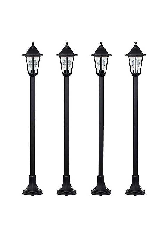 These vintage style, single head, outdoor lamp posts would make a statement in any garden. Constructed from durable black resin, they stand at 1.2m tall and offers an IP44 rating, meaning they are fully certified for outdoor installation.Set of 4Bulb Required: E27Max Wattage: 60WPrimary Material: Plastic - PolypropyleneSecondary Material: GlassDimensions approx. 122H x 17.1W x 16.5D cm