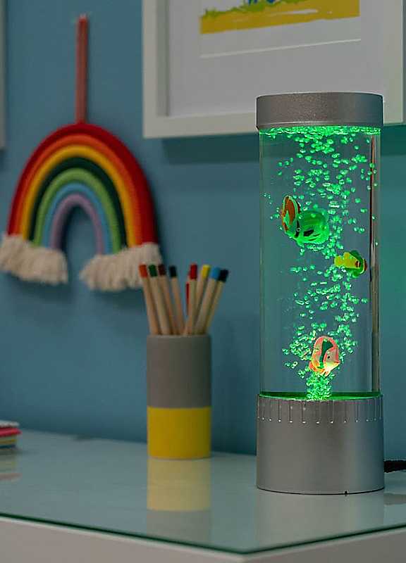 Bring home the fun of an aquarium (minus the feeding), with this 32cm Colour Changing Bubble Fish Table Lamp. Watch five playful fish float and bob as the colour-changing LED bubbles create a mesmerising, moving light show. Great for kids' rooms, parties or sensory spaces, it's a compact burst of colour, movement and calm. Just add water, plug it in and let the bubbly magic begin! | childrens table lamp, lighting cylinder, animal lamp, bedside table lamps, room decoration lamp, marine lamps, table lamp with night light, bubble lamp with fish, color changing night light, colourful table lamps, plastic led light