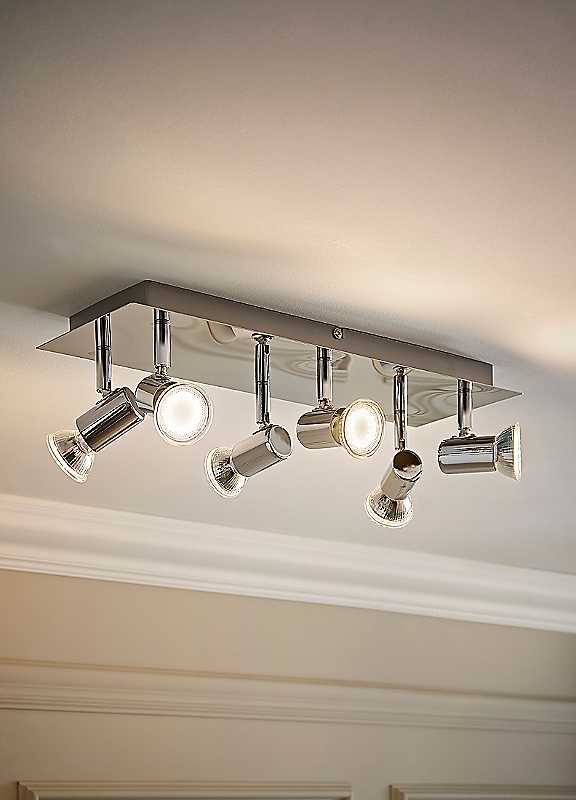 Beautiful 6 way spotlight in a silver polished chrome finish and a polished chrome ceiling plate - rectangular design. This ceiling spotlight is perfect for kitchens and any other living area within the home. Update your ceiling fittings with this stunning light. Spotlights are adjustable and can be adjusted to how you prefer them - direct the light where it is required.Brand: ValueLightsBulb Required: GU10Primary Material: Metal, Secondary Material: MetalDimensions approx. 12H x 45W x 15D cm | multi light ceiling, rectangle ceiling light, contemporary ceiling lights, surface ceiling light, modern kitchen spotlights, adjustable ceiling lighting, ceiling spotlights, kitchen ceiling lights, chrome ceiling light