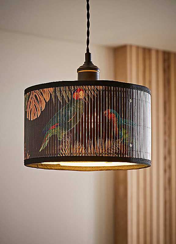 Add tropical flair to your home with the Daintree bamboo shade. Featuring a bold parrot print and 1920s-inspired glamour, this versatile lampshade fits ceiling, table, or floor lamps thanks to its reversible gimbal. Easy-fit and flat-pack ready, it's quick to install and perfect for stylish, colourful interiors. Ideal for modern, vintage, or eclectic d©cor.Bulb Required: BC B22Primary Material: Wood - BambooDimensions approx. 15H x 25W x 25D cm