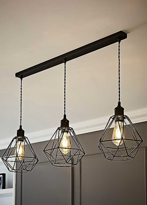 Turn heads with the Diablo 3-Drop Cluster Ceiling Light. Featuring three striking geometric wire shades, this industrial-inspired design brings modern edge and drama to your space. Perfect for adding a focal point over dining tables, kitchen islands, or in stairwells. Adjustable drops make it as versatile as it is stylish. | ceiling drop lights, black pendant light, 3 light pendant light fixture, adjustable ceiling lighting, dining table pendant light, industrial ceiling lights
