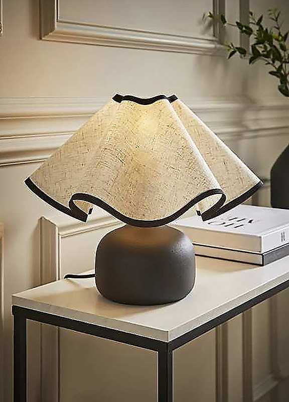 Elevate your interior with the Emilia Black Table Lamp, featuring a striking wave-design shade and a sleek round black ceramic base. The bold black trim and elevated fabric cable add a touch of luxury, making this lamp a standout piece in any room. Perfect for modern or classic interiors, Emilia delivers both warm ambient light and high-end style. It's more than a lamp, it's a designer vibe.Bulb Required: E27Max Wattage: 10WPrimary Material: CeramicSecondary Material: Fabric - Faux LinenDimensions approx. 32.5H x 36W x 36D cm