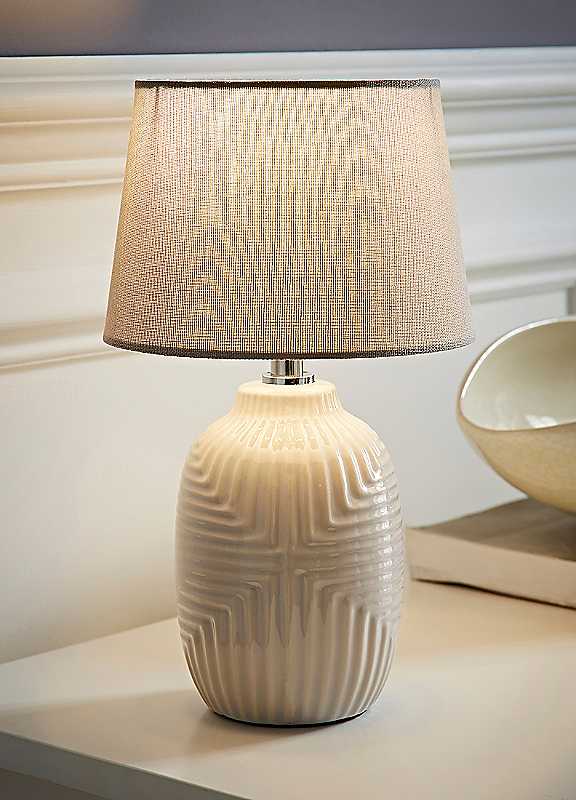 Introducing Harrison, the table lamp that brings effortless style to any room! With its glossy grey finish and geometric ribbed design, it's a real statement piece. The colour-matched fabric cable keeps things coordinated, while the brushed chrome cap offers a modern edge and levels up the quality. Topped with a soft linen shade, Harrison combines cosy lighting with contemporary flair. Available in small, medium, and large, it's the perfect choice for any space looking for a little extra glow.Bulb Required: E14Max Wattage: 7WPrimary Material: CeramicSecondary Material: Fabric - Faux LinenDimensions approx. 28.5H x 18W x 18D cm