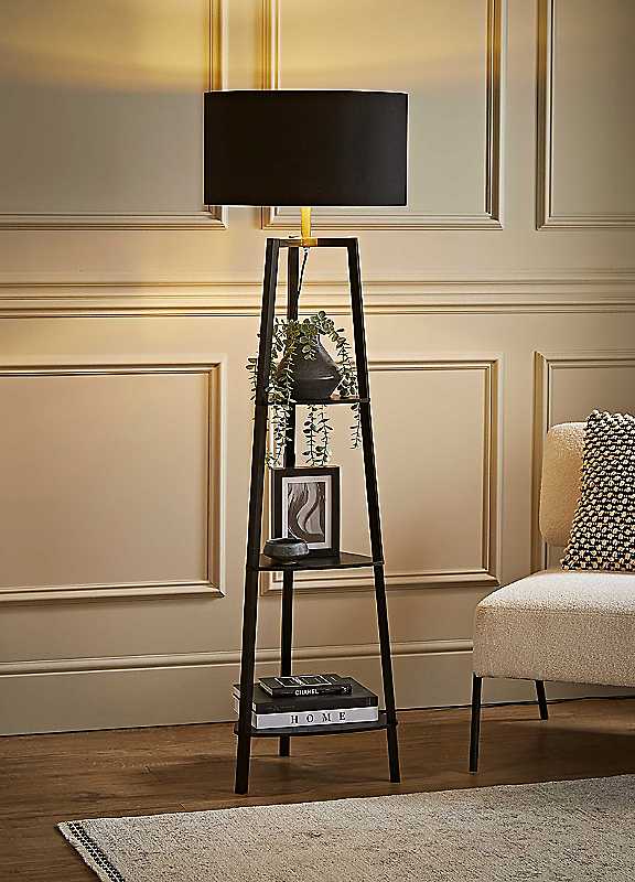 ValueLights Hiru Black 3 Tier Shelf Floor Lamp with Metallic Gold Inner Shade