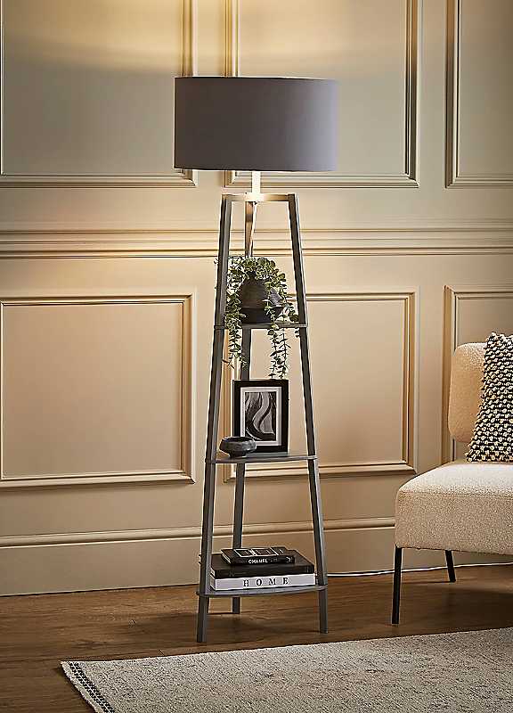 ValueLights Hiru Grey 3 Tier Shelf Floor Lamp with Metallic Silver Inner Shade