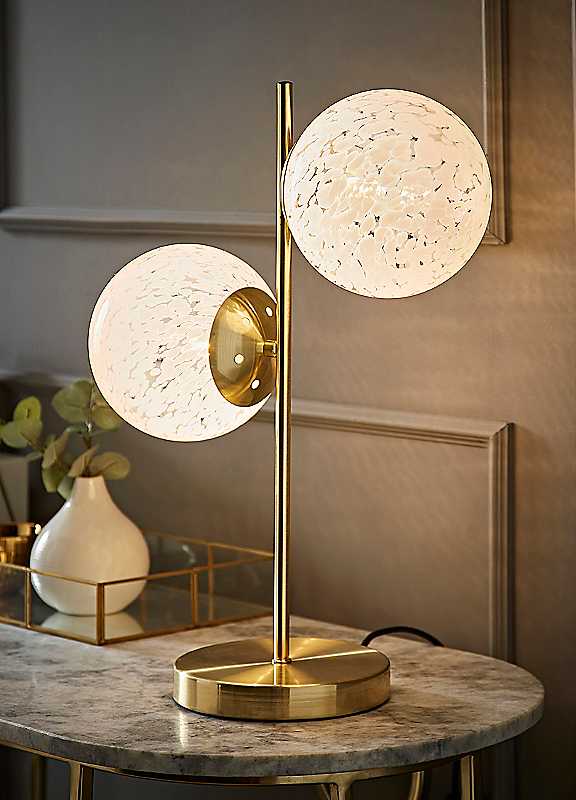 Pump up the glam with the Jas brushed gold table lamp - a bold blend of sparkle and style! Featuring 2 dazzling confetti glass globes and a luxe brushed gold finish, this statement light brings instant wow to any room. Mix and match with the Jas or India lighting ranges for a custom look. Perfect for lounges, bedrooms or anywhere that needs a glow-up. Just add 2 G9 bulbs and let the Jas magic shine!Bulb Required: G9Max Wattage: 10WPrimary Material: MetalSecondary Material: GlassDimensions approx. 46H x 33W x 16D cm