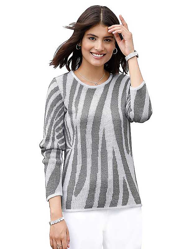 A real highlight! The elaborate jacquard pattern on the sweater has fine, Silver-coloured striking yarn running through it. Glittering decorative yarn Extravagant jacquard design Round neckline Long sleeve No fastening Washable 87% Acrylic, 8% Polyester, 5% Metallised Threads Length approx. 66 cm (26 in)