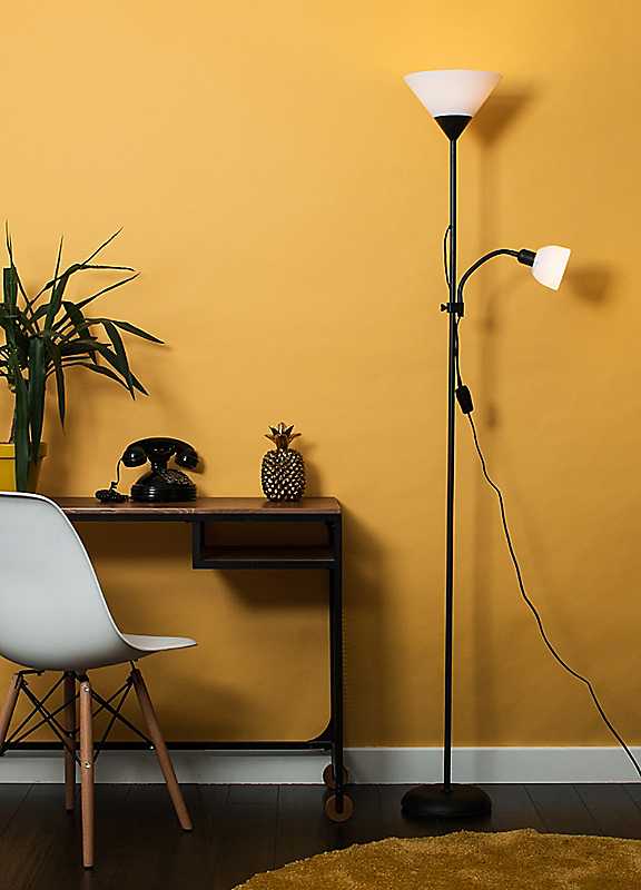 The Mozz mother and child floor lamp gives you the perfect lighting solution from the single stem uplighter floor lamp that comes with an adjustable arm focus lamp. Perfect for placing in living rooms, bedrooms, hallways or in the office, this stylish and contemporary floor lamp gives you the flexibility you need for your home.