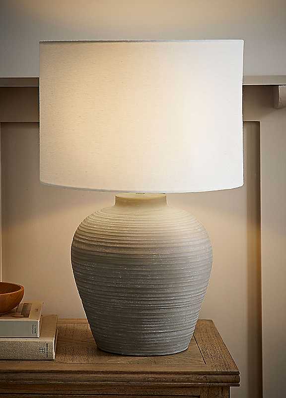 Introducing Reid, the table lamp that brings effortless style to any room! With its hand-finished grey ribbed ceramic base and crisp white drum shade, it's a real statement piece. The colour-matched fabric cable keeps things coordinated, while the brushed chrome cap offers a modern edge and enhances the lamp's overall quality. Reid combines cosy lighting with contemporary flair. It's the perfect choice for any space looking for a little extra glow.Bulb Required: E27Max Wattage: 10WPrimary Material: CeramicSecondary Material: FabricDimensions approx. 54.5H x 36W x 36D cm