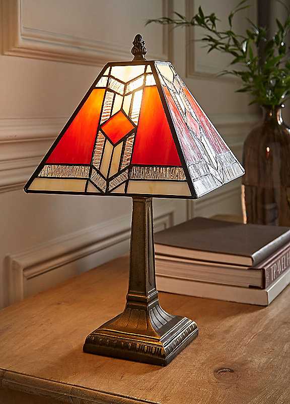 Add a bold twist to your lighting with this Tiffany inspired table lamp! Featuring an eye-catching Aztec-style design in warm ivory and deep red stained glass, it's full of personality. The antique brass base adds a vintage touch, while the soft glow brings instant cosiness. Whether it's lighting up a rustic farmhouse corner or adding flair to a city loft, this lamp is ready to steal the show; stylish, striking, and seriously good fun!
