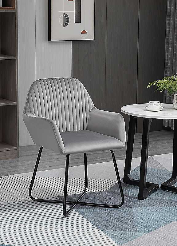 Bring modern elegance and standout style into your home with this velvet-feel accent chair. Designed with a unique multi-angle form, it features a smoothly curved back, a boxy front, and a striking criss-cross metal base - making it both a statement piece and a versatile addition to various spaces like the living room, bedroom, dining area, or home office. Upholstered in soft, velvet-feel fabric with subtle line indents on the backrest, this chair delivers a touch of luxury while remaining comfortable and supportive. The tall backrest, cushioned seat, and integrated armrests are filled with sponge padding, allowing you to sit comfortably for extended periods. The sturdy metal base is designed in a modern cross-over shape, enhancing both style and stability. Plus, protective foot pads help prevent damage to your floors.Weight capacity: 120 kgAssembly requiredUnique multi-angle shape with a curved back and criss-cross base for a modern, eye-catching lookVelvet-feel upholstery with stitched detailing adds texture and sophisticationCushioned seat, high back, and armrests provide support and comfortMetal base offers reliable support and stylish contrastProtective foot pads help prevent floor scratchesSuitable for use in the living room, dining area, bedroom, or home officeVelvet (100% Polyester), Sponge, MetalOverall dimensions approx. 85H x 60W x 56.5D cmSeat dimensions approx. 49H x 41W x 41D cmBack size approx. 55W x 39L cmPlease remember to measure your available space before ordering. If using on an un-carpeted floor we recommend rubber or felt protection pads be used under the legs to avoid damage to your floors. | grey velvet accent chair, grey velvet office chair, grey velvet desk chair, velvet accent armchair, accent lounge chair, grey velvet arm chair