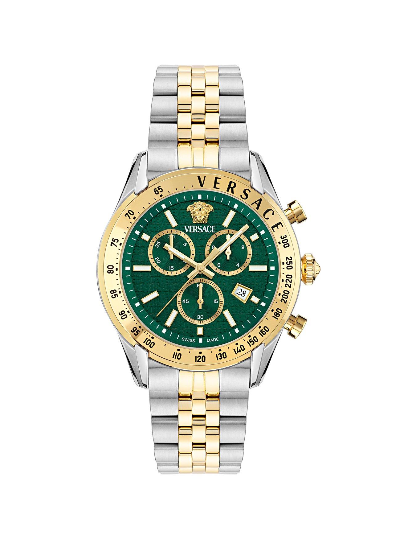 Versace Chrono Master Gents Watch A New Masculine Timepiece With A 44 Mm Case Body Enriched With A Chrono Movement And Window Date At 4H. The Green Dial Is Enriched With Versace Logomania Pattern While The Top Ring Features Bold Logo And Numbers With Two Tone Bracelet 24Hr Display: N Depth: 11.15 Mm Height: 44 Mm Width: 44 Mm Case Diameter (In Cm): 4.4 Case Height (In Cm): 4.4 Case Length (In Cm): 4.4 Case Shape: Round Case Width (In Cm): 4.4 Fastening Type: Bracelet Glass: Sapphire Movement: Swiss Quartz (Battery) Strap Material: Stainless Steel Water Resistant: Y