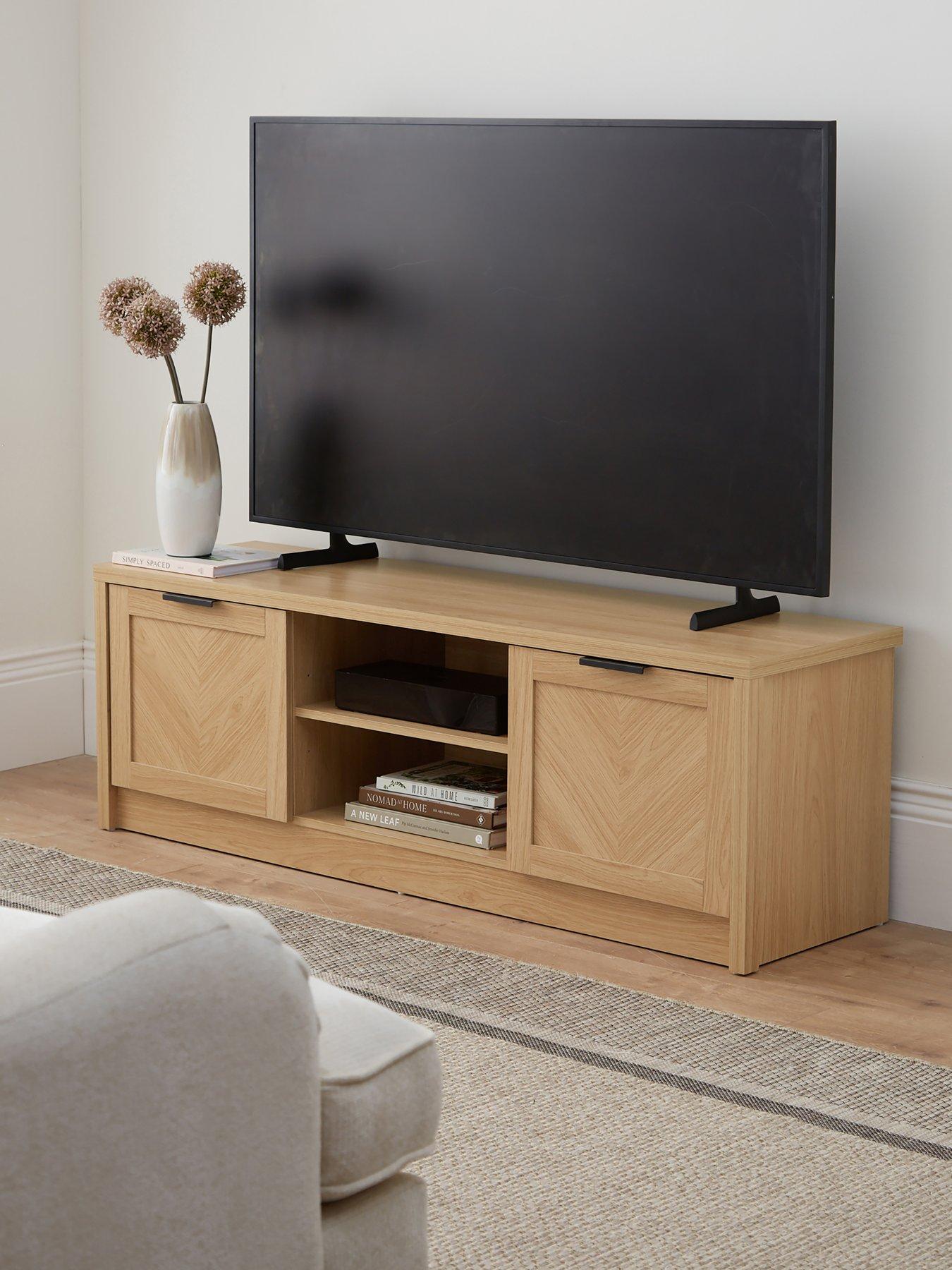 Very Home Chevry Tv Unit In Oak Effect - Suitable For Televisions Up To 65 Inch From Very Home'S New Chevry Range, This Tv Features Framed Doors With Chevron Detail And It'S All Wrapped Up In An Oak-Effect That Flaunts A Fab Grained Pattern. Finished With Black Metal Handles, Its Open Shelves Boast Cable Management Cut-Outs To Keep Wires Neat And Tidy. Please Remember To Measure Your Available Space Before Ordering. Dimensions: Height 46.8, Width 140, Depth 39.8 Cm Assembly: Self Assembly Depth: 39.8 Cm Height: 46.8 Cm Material Content: Particle Board With Paper Lamination Width: 140 Cm Number Of Doors: 2 Door Number Of Drawers: 2 Fishbone Effect Fits Up To 65" Tv Number Of Doors: 2