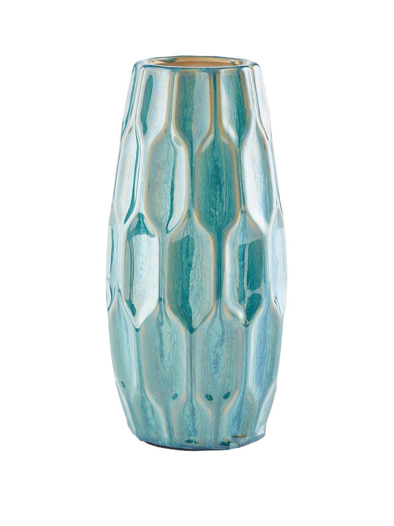 River Ceramic Vase - 24.5 cm The unique feeling of calm that only modern art-inspired designs can create flows through the striking looks of our River ceramic vase. Standing 24.5 cm tall in a gorgeous palette of gradient blue tones, it's easily matched to most contemporary decors and looks fantastic on a sideboard or when used as a dining table centrepiece. A faceted textural motif pattern runs all around the exterior, while the glazed finish gives it a rippling, river-like sparkle. Suitable for use with real or artificial plants and flowers, it looks just as good filled as it does as a purely decorative piece. Height 24.5 x Diameter 11.5cm Material Content: 100% Stoneware Can be used with real or artificial plants/flowers