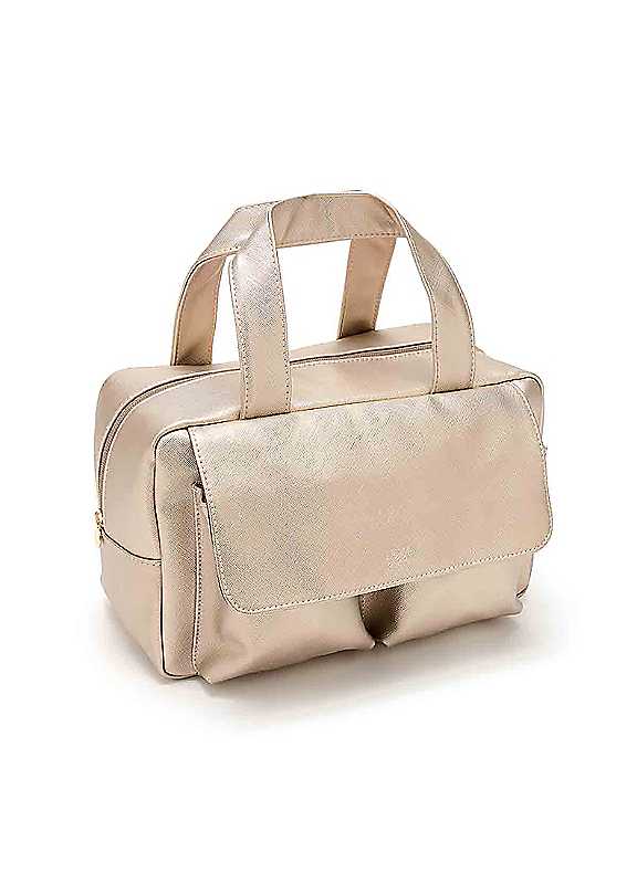 A luxurious, champagne gold colour, this is our largest wash bag for when you want to take it all! The super spacious interior compartment is designed to pack all your toiletries upright. Interior elasticated pockets allow you to secure items separately. Two handy front pockets with luxe magnetic dot fastenings ensure smaller items can be stored securely and found easily. All the compartments are lined with wipe-clean fabric in case of any leaks.Why this is a great choice:- Large main compartment for full size bottles- Two secure front pockets to keep smaller items safe- Two elasticated pockets inside- Sturdy grab handles- Leak-proof design to eliminate spillage incidentsGood to know:- Robust and wipe clean for easy-care- Crafted from sustainable recycled materials- 100% Phthalate free- Cruelty free and vegan- Matching large makeup bag | large wash bag, vanity travel bag, large toiletry bag, travel wash bag