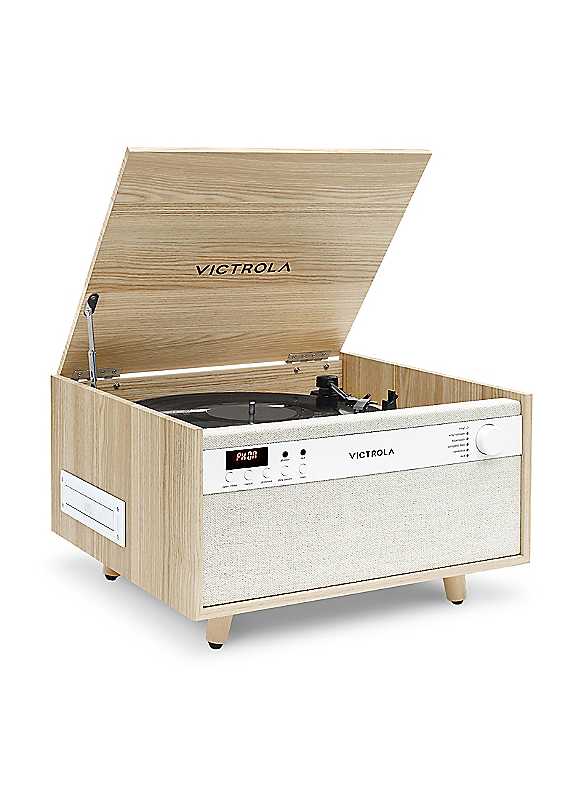The Victrola Century 6-in-1 music centre brings elegant mid-century design to the all-in-one entertainment centre, featuring a 3-speed turntable, CD and cassette players, and Bluetooth® technology.Mid-century modern 6-in-1 music centre features a 3-speed turntable, CD and cassette players, VINYLSTREAM and Bluetooth® connectivity, and a 3.5mm auxiliary input.Built-in stereo speakers provide room-filling soundBluetooth connectivity for streaming music from any Bluetooth-enabled device to the integrated stereo speakersVINYLSTREAMTM output enables wireless vinyl streaming to Bluetooth® speakers and headphonesExpanded connectivity options with aux input and RCA and headphone outputs.Inputs: Bluetooth, AUX, CD, CassetteOutputs: Vinylstream (Bluetooth), Headphone, RCATurntable: 3-Speed belt drive7 Inch Platter (plastic)Fixed counterweightFixed headshellCartridge ITNP-LC1In the box: Victrola century music centre, power adapter, instruction manualDimensions approx. 41.1W x 37.9D x 19.8H cm