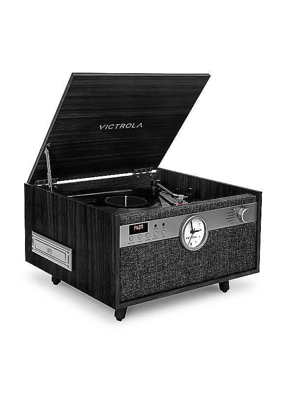 The Victrola Century 6-in-1 music centre brings elegant mid-century design to the all-in-one entertainment centre, featuring a 3-speed turntable, CD and cassette players, and Bluetooth® technology. This signature model features an illuminated analogue clock and enhanced stereo speakers.Mid-century modern 6-in-1 music centre features a 3-speed turntable, CD and cassette players, VINYLSTREAM and Bluetooth® connectivity, and a 3.5mm auxiliary input.Built-in stereo speakers provide room-filling sound.Bluetooth connectivity for streaming music from any Bluetooth-enabled device to the integrated stereo speakers.VINYLSTREAMTM output enables wireless vinyl streaming to Bluetooth® speakers and headphones.Expanded connectivity options with aux input and RCA and headphone outputs.Turntable: Belt-driven 3 speed7 inch platter (plastic)Fixed counterweightFixed headshellCartridge ITNP-LC1Inputs: Bluetooth, AUX, CD, CassetteOutputs: Vinylstream (Bluetooth), Headphone, RCADimensions approx. 41.1W x 37.9D x 19.8H cm