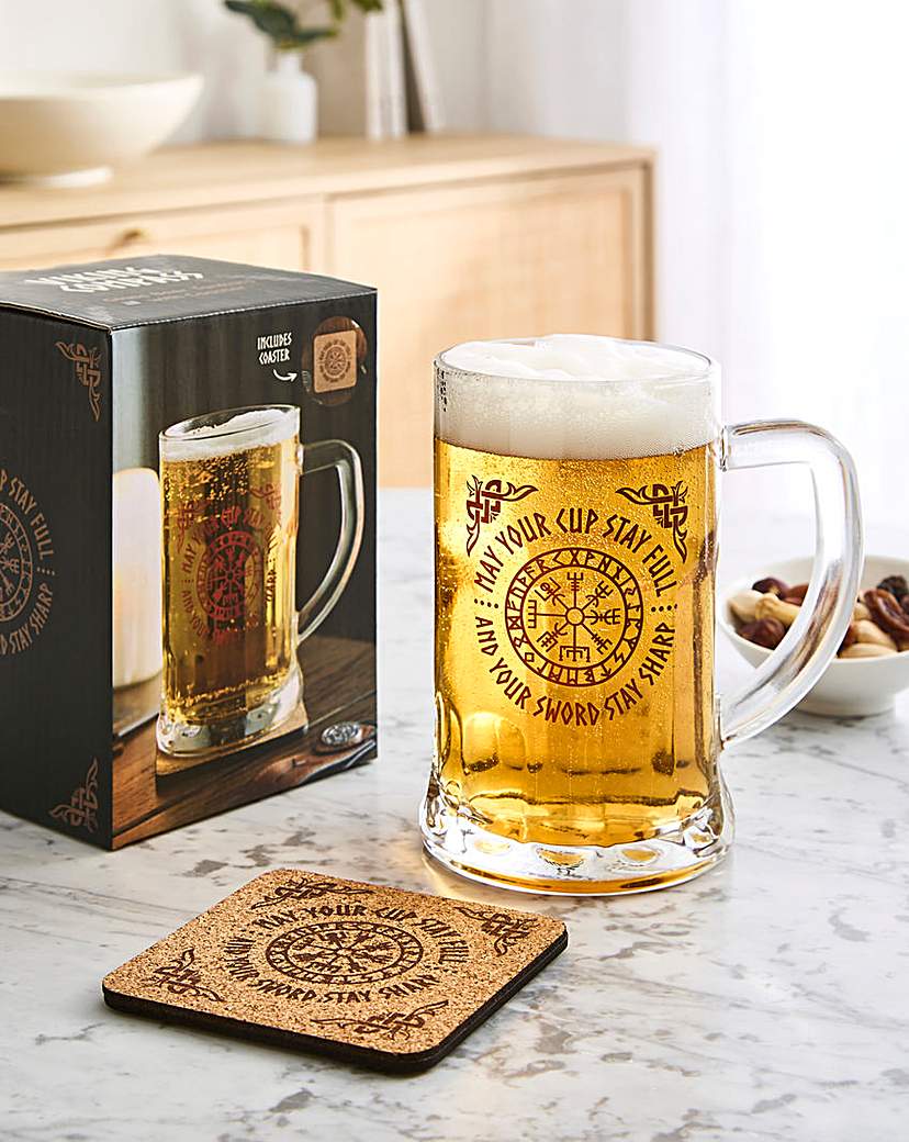 Raise a toast to Viking heritage with this glass beer tankard, showcasing a Vegvisir compass design and matching cork coaster. With a generous 500ml capacity, its ideal for enjoying a chilled brew and makes a unique gift for lovers of Norse mythology and traditional craftsmanship. Do not microwave. Hand wash only.