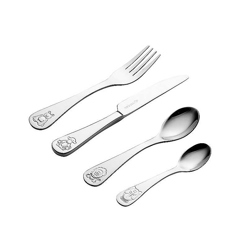 This kids cutlery set is all you need to make mealtime fun and exciting for your little one. With its jungle animal embossed contoured handles and smooth edges, it's designed and produced with little hands and mouths in my mind.This Viners 4 piece cutlery set is perfect for children as they grow and learn to eat independently. The set includes 1 x table knife, 1 x table fork, 1 x dessert spoon, and 1 x tea spoon, packaged in an adorable jungle-themed gift box.Made from mirror polished 18/0 stainless steel with children's safety in mind, the long-lasting set is rust-resistant and dishwasher safe. The knife has a slight, yet safe serration letting children cut their own food without harm.This children's cutlery set is unique and intended to make mealtimes frustration free and enjoyable.VinersĀ® has existed for over 110 years and has become a much-loved British brand and household name, steeped in heritage. Set of 4 Set includes: 1 x table knife, 1 x table fork, 1 x dessert spoon, & 1 x tea spoon Packaged in an adorable jungle-themed gift box Long-lasting & rust-resistant Comes with a 25 year guarantee Dishwasher Safe Stainless Steel Dimensions approx. 16.5 x 3 x 28 cm