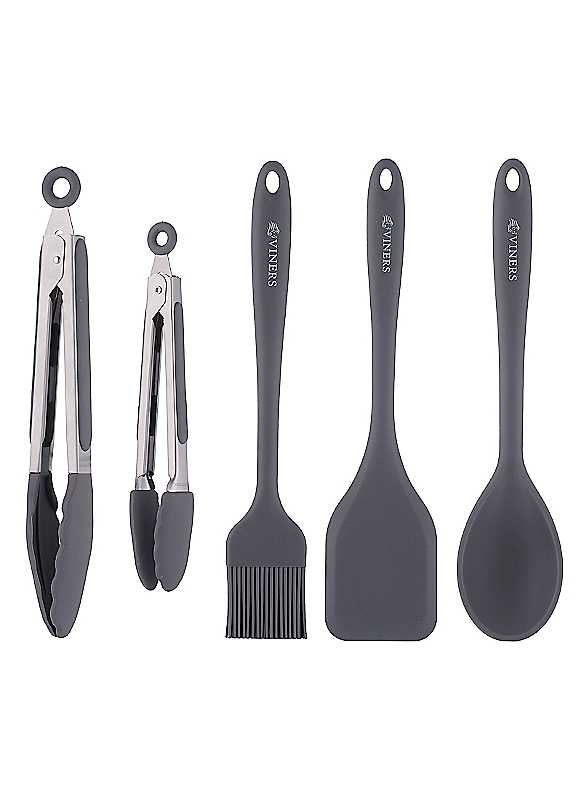 Blending timeless design with everyday functionality, the Viners® 5-Piece Kitchen Utensil Set is crafted to bring strength, durability, and style to your kitchen. This versatile set includes two stainless steel food tongs (18cm and 23cm), a non-stick silicone turner, a solid spoon, and a silicone basting brush-everything you need for effortless cooking, serving, and prepping. Each utensil has been thoughtfully designed with comfort and performance in mind. The stainless steel tongs offer precision handling with a sturdy, non-slip grip that's ideal for safely lifting hot food straight from air fryer drawers or oven trays. The silicone turner and spoon are made from high-quality, heat-resistant silicone, ensuring safe use on all non-stick cookware without damaging surfaces. The basting brush is perfect for glazing, marinating, or buttering, with flexible silicone bristles that are easy to clean and gentle on cookware. All five utensils feature an elegant combination of soft grey and silver tones that complement any kitchen style. With practicality at their core, each tool includes a built-in hanging hook for simple storage and is dishwasher safe for hassle-free cleaning. Trusted for over 110 years, Viners® is a beloved British brand known for quality craftsmanship and heritage. This utensil set is a stylish, reliable choice for any home cook looking to elevate their kitchen essentials.This versatile set includes two stainless steel food tongs (18cm and 23cm), a non-stick silicone turner, a solid spoon, and a silicone basting brush-everything you need for effortless cooking, serving, and prepping. The silicone turner and spoon are made from high-quality, heat-resistant silicone, ensuring safe use on all non-stick cookware without damaging surfaces. The basting brush is perfect for glazing, marinating, or buttering, with flexible silicone bristles that are easy to clean and gentle on cookware. All five utensils feature an elegant combination of soft grey and silver tones that complement any kitchen style. With practicality at their core, each tool includes a built-in hanging hook for simple storage and is dishwasher safe for hassle-free cleaning.Silicone | stainless steel kitchen utensil set, stainless steel kitchen utensils, kitchen utensils tongs, silicone cooking utensils, stainless steel kitchen tools