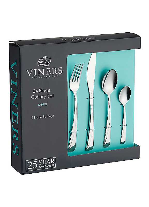 This unique cutlery design follows the classic shape with an added stylish detail. The set is expertly balanced with contemporary handles that are slender and smooth. Add that special finishing touch to any table setting with Angel. This versatile set is perfect for everyday and fine dining. The set includes 6 x table knives, 6 x table forks, 6 x tea spoons and 6 x dessert spoons. Made from fine quality 18/0 steel, our cutlery is polished to a mirror finish. The long-lasting set is rust-resistant and can be used in the dishwasher. The Angel collection is elegantly shaped with an arc that sweeps across the handle. It is simple enough for everyday use but equally perfect for a formal setting. This 24 piece set comes in a gift box making it the ideal wedding gift. Viners has existed for over 110 years and has become a much-loved British brand and household name, steeped in heritage. We pride ourselves on delivering excellence - elegant, robust cutlery that comes with a 25 year guarantee.6 x Table forks6 x Table knives6 x Tea spoons6 x Dessert spoonsMade from fine quality 18/0 steel, our cutlery is polished to a mirror finishThe long-lasting set is rust-resistant & can be used in the dishwasherStainless Steel