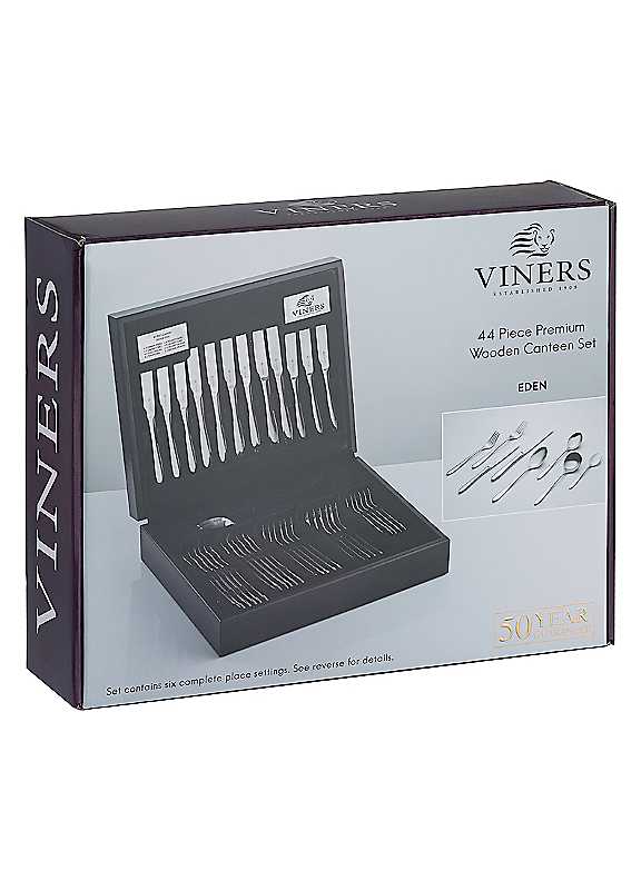 This flatware cutlery set is enviably stylish and based on a modern teardrop shape. The 44 piece set is expertly balanced with slender, smooth, rounded handles and elegant curves that are a delight to hold. The knives in this set are forged using a rod of hardened stainless steel for extra weight, balance and a fine cutting edge. Add that special finishing touch to any table setting with Eden. This set includes 6 x table knives, 6 x table forks, 6 x tea spoons, 6 x soup spoons, 2 x serving spoons, 6 x dessert knives, 6 x dessert forks and 6 x dessert spoons. The 44pce set comes in a wooden canteen box and makes a special wedding gift. Made from fine quality 18/10 steel, our cutlery is polished to a mirror finish. The long-lasting set is rust - resistant and can be used in the dishwasher. This once in a lifetime purchase is made to pass generation to generation. Viners has existed for over 110 years and has become a much-loved. British brand and household name, steeped in heritage. We pride ourselves on delivering excellence - elegant, robust cutlery that comes with a 50 year guarantee.6 x Table knives6 x Dessert spoons6 x Table forks6 x Tea spoons6 x Soup spoons2 x Serving spoons6 x Dessert knives6 x Dessert forksThe 44 piece set comes in a wooden canteen box & makes a special wedding giftMade from fine quality 18/10 steel, our cutlery is polished to a mirror finishThe long-lasting set is rust - resistant & can be used in the dishwasherStainless Steel | minimalist silverware, rust proof flatware, dining cutlery set, dishwasher safe cutlery, everyday cutlery set, polished cutlery set, stainless steel set, modern flatware set, stylish cutlery set