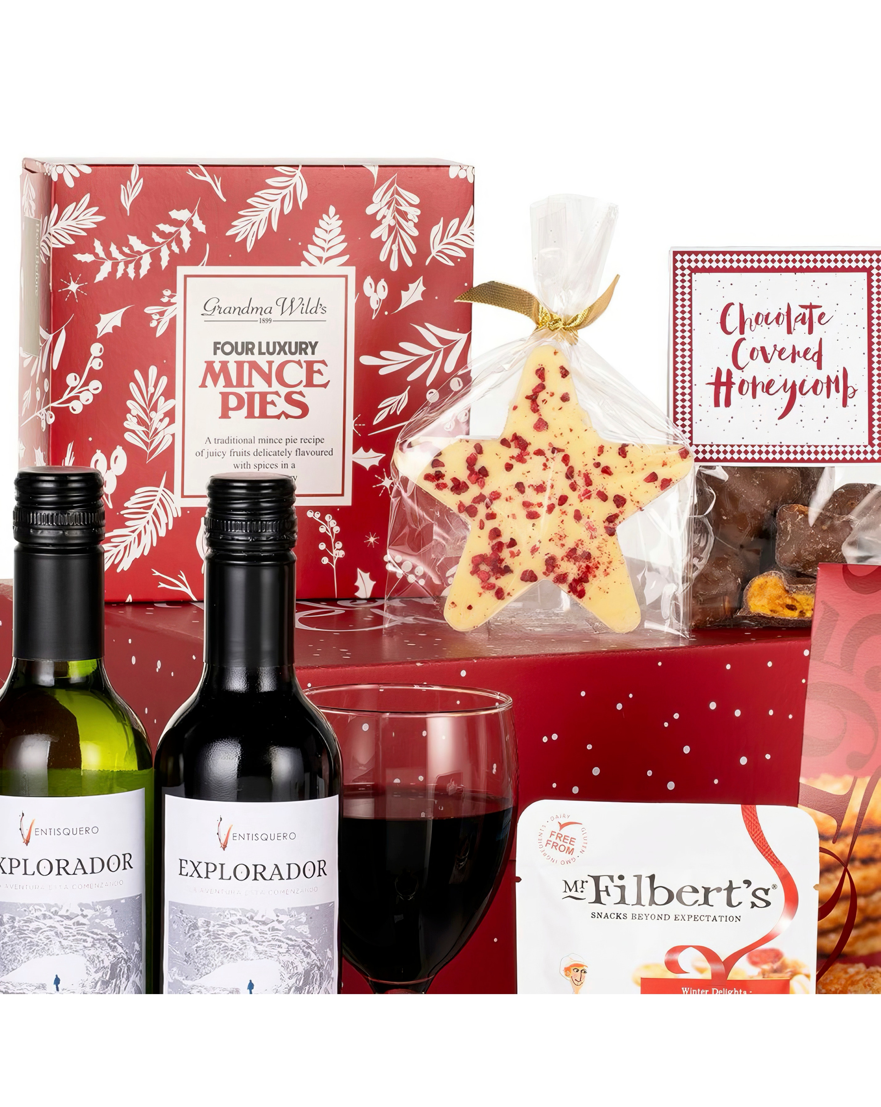 Celebrate the festive season in extraordinary style with our Winter Wonderland Hamper, a carefully curated collection of seasonal favourites designed to delight recipients, customers, and family alike. Presented in an elegant hinged box, this hamper combines traditional treats with gourmet flair to create a memorable holiday experience. Savour the classic charm of Grandma Wild's luxury mince pies, perfectly complemented by the rich indulgence of Clarence & Bean chocolate-covered honeycomb and a delicate white chocolate star adorned with raspberry pieces. Enjoy the satisfying crunch of Mr Filbert's roasted nuts and plump fruits mix alongside buttery Crunch & Crumble shortbread biscuits. Perfect for sending joy to friends and family during the festive season. Includes: Buiteman 1958 Range Cheddar Biscuits 75g. Clarence & Bean Chocolate Covered Honeycomb 100g. Crunch & Crumble Shortbread Biscuits 150g. Grandma Wild's 4 Luxury Mince Pies. Mr Filbert's Roasted Mixed Nuts & Plump Fruits 40g. Stas Chocolatier Decorated White Chocolate Star 50g. Cabernet Sauvignon Ventisquero Explorador Chile 37.5cl 13% vol. Sauvignon Blanc Ventisquero Explorador Chile 37.5cl 12.5% vol. Gift Box. You must be over 18 to purchase this product. To confirm the recipient is over 18 years old, valid photographic ID with a date of birth may be required upon delivery. Please note we are unable to deliver this item ROI or Northern Ireland.