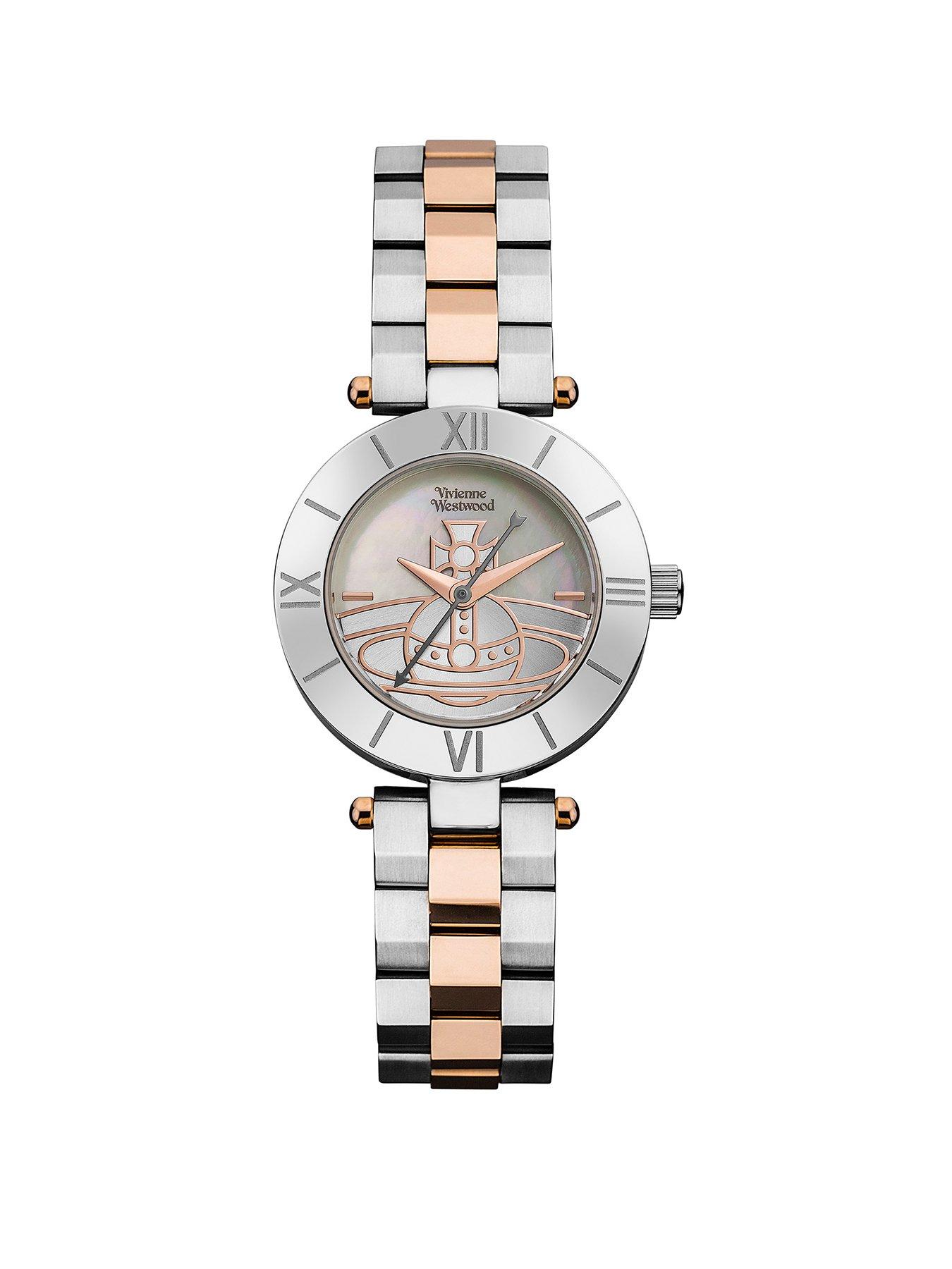 Vivienne Westwood Westbourne Orb Size & Fit Available in one size Details Westbourne Orb by Vivienne Westwood Two Tone Indulge in timeless elegance with the Vivienne Westwood Westbourne Orb Two-Tone Watch - a masterpiece of refined craftsmanship and iconic design. This exquisite timepiece seamlessly blends sophistication with a touch of rebellious charm, embodying the essence of Vivienne Westwood's signature aesthetic. The 2-tone stainless steel bracelet exudes effortless luxury, while the contemporary silver dial features the unmistakable Westwood Orb emblem - a symbol of avant-garde style and heritage. Designed with precision, it features a Swiss Ronda movement, ensuring impeccable timekeeping with every glance. Whether paired with a tailored ensemble or worn as a statement accessory, this watch is a celebration of individuality and prestige. 24Hr Display: N Depth: 9 MM Height: 28 MM Width: 28 MM Case Diameter (in cm): 2.8 Case height (in cm): .9 Case Length (in cm): 2.8 Case Shape: Round Case Width (in cm): 2.8 Fastening Type: Bracelet Glass: Mineral Movement: JapaneseQuartz(battery) Strap Material: Stainless Steel Water Resistant: Y Hours, minutes, seconds