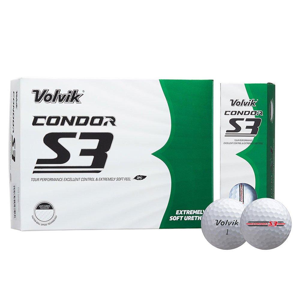 Volvik Condor S3 Tour Soft 12 Golf Ball PackKey Features - Premium 3-piece BallHyper-White Carbon Soft CoreDouble Flat Dimple PatternCompression 80Mid - High TrajectoryThis premium 3-piece golf ball features a soft/flexible urethane cover and a Hyper-White carbon soft core. White carbon technology is applied to the core, boosting elasticity for greater distance, and a double flat dimple pattern for improved flight stability. The ball provides tour performance with an incredibly soft feel and offers excellent control.