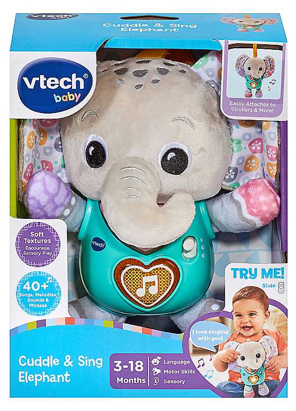 Hello! I'm a friendly elephant! Cuddle & Sing Elephant is a cute, caring, learning friend who will love to play with your little one! Press Elephants light up button to learn basic numbers using Elephant's body parts, feelings, and lots of fun phrases! 3 lovely sing-along songs and 15 happy melodies add to the learning fun. Gently shake Elephant to see & hear beads rattle! Pressing the light up button enhances fine motor skill development and soft huggable body & crinkle ears encourage tactile stimulation. Attach Elephant to a pushchair or infant carrier for fun on the go. English speaking voice promotes recognition and accelerates learning. Brand: Vtech Age suitability: 3-18 Months Cuddle & Sing Elephant is a cute, caring, learning friend who will love to play with your little one Press Elephants light up button to learn basic numbers, feelings, & lots' of fun phrases 3 lovely sing-along songs & 15 happy melodies add to the learning fun Gently shake Elephant to see & hear beads rattle Pressing the light up button enhances fine motor skill development & soft huggable body & crinkle ears encourage tactile stimulation Attach Elephant to a pushchair or infant carrier for fun on the go WARNING: Remove product from the infant carrier when the vehicle is moving. WARNING: Keep this soft toy out of the sleeping environment for babies under twelve months to avoid suffocation risk.
