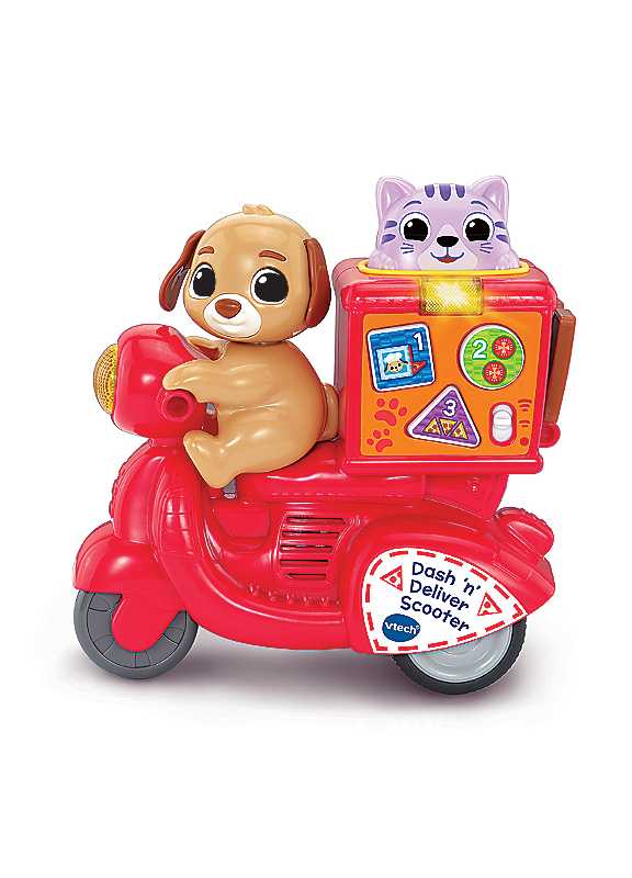 Get ready for tasty learning fun with the Dash n' Deliver Scooter! Join Puppy and his playful sidekick Kitty as they deliver hot, fresh pretend pizzas to eager learners. Press down on Kitty to hear cheerful phrases and set the scooter in motion for exciting delivery adventures. With 3 interactive buttons, children can explore foods, colours, and numbers, making learning both fun and engaging. The scooter also features 12 lively melodies and 3 catchy songs to keep little ones entertained. Perfect for imaginative role play, this adorable set encourages early learning, active play, and endless pizza-themed adventures full of giggles!Join Puppy and Kitty for fun pizza delivery adventures on a playful scooter Press Kitty to hear cheerful phrases and set the scooter in motionExplore foods, colours, and numbers with 3 interactive press buttonsFeatures 12 lively melodies and 3 catchy sing-along songsEncourages imaginative role play, early learning, and active funIncludes: Dash n' Deliver Scooter, Quick Start Guide, 1 sticker sheet with 2 stickersRequires 2 x AAA Batteries (included for demo purposes only). New batteries recommended for regular use12-36 monthsWARNING: All packing materials such as tape, plastic sheets, packaging locks, removable tags, cable ties, cords and packaging screws are not part of this toy and should be discarded for your child's safety.