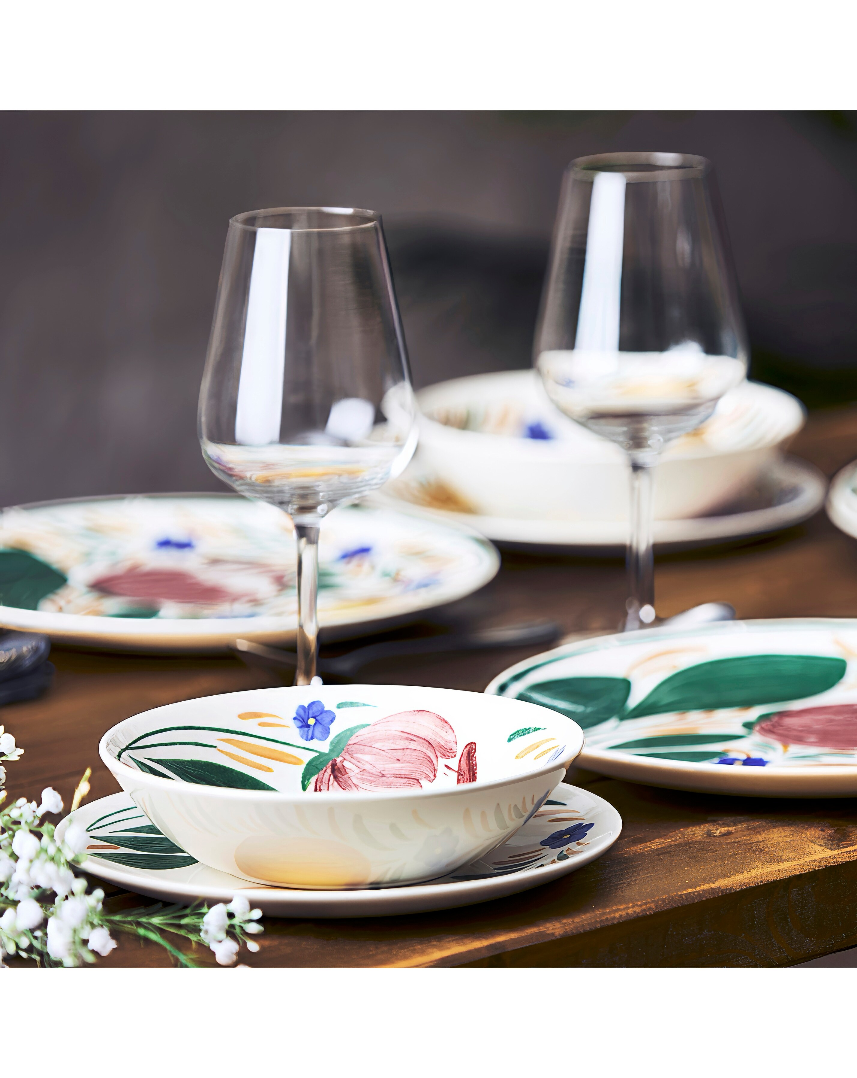Add a touch of sophistication to any table setting with this eye-catching 12Pc Set from Wades Capri Collection. Inspired by classic hand painted designs from the Wade archive, the vibrant multi-coloured patterns evoke memories of the Mediterranean or a tropical paradise. The deep coupe shape of the cereal bowl is perfect for creating your favourite dishes and prevents overfilling and spillages, so you can enjoy larger portions of healthy fruit salad, creamy porridge or your preferred cereal. The 28cm diameter of the dinner plate offers plenty of space to creatively present food to impress guests for dinner parties. The 22.75cm diameter of the side plate is ideal for serving cakes and smaller side dishes to guests, The coupe shape also ensures the dishes can be safely stored with other parts of the Capri Collection for convenience. Crafted in Stoke-on-Trent at the heart of the potteries industry using high quality English earthenware with great durability, its exceptional craftmanship guarantees a premium long-lasting product. You can use them in the microwave for easy reheating of meals whilst theyre also dishwasher safe for a simple and fuss-free clean. STACKABLE DESIGN: These dishes are designed for simple storage with the rest of the Botanical Night Collection, as all dishes & bowls can be stacked together for convenience. PART OF THE CAPRI COLLECTION: Create the perfect co-ordinated dinnerware set utilising classic designs and unique patterns that complement each other and provide the ideal platform to showcase your culinary creations. Drawing inspiration from hand painted patterns from the Wade archives, the vibrant colours combine traditional & contemporary design for an eye-catching aesthetic. 3 YEAR GUARANTEE: Timeless Wade quality with a 1-year guarantee & optional 2 year extension, subject to product registration online.