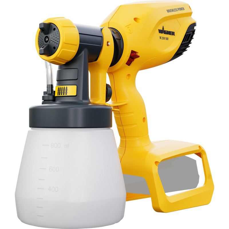 Enjoy unlimited flexibility for painting projects around your home with the W250 18V cordless sprayer. With no cables, you can apply paints, varnishes, and glazes quickly and effortlessly to freshen up fences, sheds, or garden furniture. The brushless motor ensures optimised battery life and high performance. It's compatible with the Bosch Green 18V POWER FOR ALL system. Please note, the battery and charger are not included. * Click&Paint system – makes changing colours and cleaning effortless * Enveloping air jacket – requires less preparation and masking * Adjustable paint volume – for precise, controlled painting * Vibrating handle – alerts you to a low battery to avoid interruptions * Three-way adjustable jet – can be set horizontally, vertically or for detail work | Wagner W250 18V Cordless Wood & Metal Sprayer Body Only in Yellow