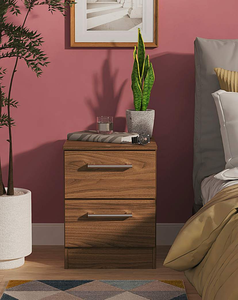The Briar 2 drawer bedside table is finished in a walnut wood effect colourway, polished metal handles and is fully scratch resistant. This product is made to order in the UK, ready assembled for you to use as soon as it has been delivered. Please note: We are unable to deliver to Ireland, Scottish Islands, Isle of Wight and Isle of Man.