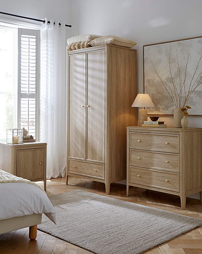 The Charlotte Package includes, 2 side tables, a chest of drawers and a wardrobe, al finished in a washed oak effect. Self assembly required.