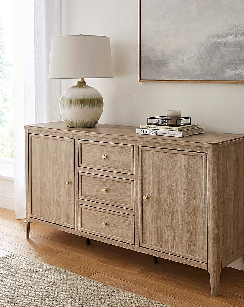 The Charlotte Large Sideboard had 3 drawers, with a cupboard either side, finished in an washed osk. Self assembly
