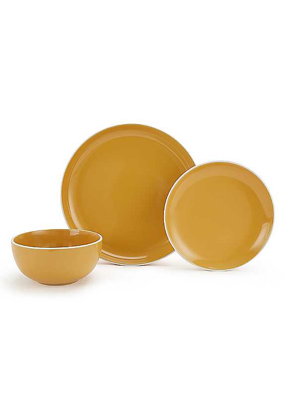 The 12 Piece Saffron Dinner Set by Waterside is a vibrant, contemporary stoneware dinnerware set designed for four people.The set features a bold saffron yellow colour with white rims and a glossy finish. It's dishwasher and not microwave safe, making it both stylish and practical for everyday use. Known for its durability, it's also highly rated by customers for its quality and vibrant design.Set includes:4 dinner plates (27 cm)4 side plates (20.5 cm)4 bowls (15 cm)