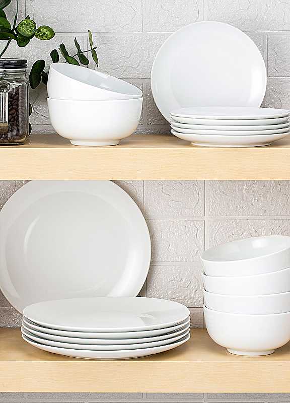 6x Dinner plates 10.5 inch 6x Side plates 7.5 inch 6x Deep bowls 5.5 inch D©cor: Super WhiteMaterial: Porcelain Dishwasher & Microwave Safe