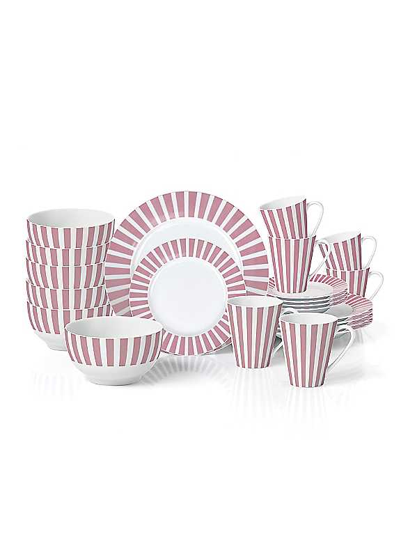 The 24 Piece Soft Pink Split Stripe Porcelain Dinner Set offers a sophisticated and modern touch to your dining table with its bold design. The set features a sleek white base with a striking split stripe pattern, creating a contemporary look that effortlessly complements any occasion, from casual dinners to formal gatherings. Crafted from high-quality porcelain, this dinner set is durable, microwave-safe, and dishwasher-friendly, making it both practical and stylish for everyday use. The contrasting stripes add a chic and eye-catching element to each piece, while the clean, minimalist design ensures it pairs well with various table settings. Whether you're hosting a dinner party or enjoying a meal with family, the 24 Piece Split Stripe Porcelain Dinner Set brings elegance and modern flair to your dining experience.This set includes: 6x10.5 inch Dinner Plate, 7.5 inch Side Plate, 5.5 inch Deep Bowl, 12oz Mug.Dinner plate size approx. 6 x 10.5 inchSide plate size approx. 7.5 inchDeep bowl size approx. 5.5 inch Deep Bowl, 12oz Mug
