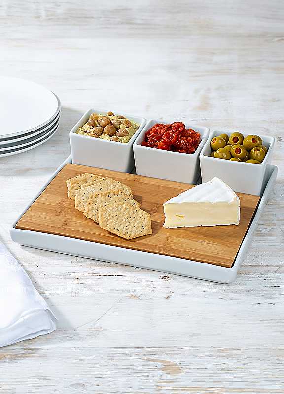 Ideal for showcasing cheese assortments, this platter is dishwasher and microwave safe, except for the bamboo board. The platter is constructed from porcelain, while the board is crafted from bamboo. 1x tray 24 x 24 x 2 cm 3x mini bowls 7.5vx 7.5 cm 1x bamboo wood board 21.8 x 15.2 cm D©cor: White & Bamboo board Material: Porcelain & bamboo board Dishwasher & Microwave Safe
