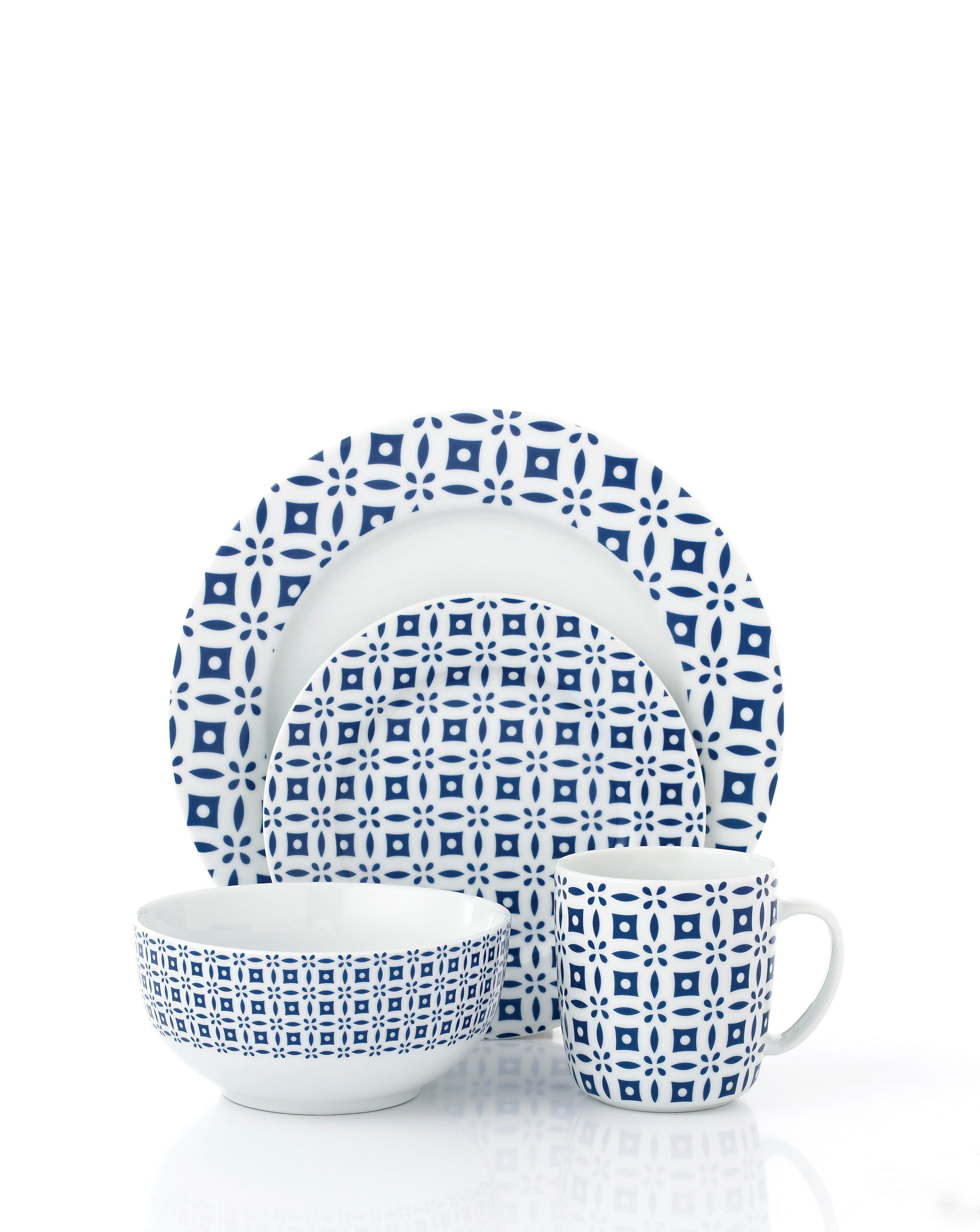 Waterside Blue Geo 16 Piece Dinner Set comes with 4x 10.5inch Dinner Plate, 7.5inch Side Plate, 5.5inch Deep Bowl & Mugs. Dishwasher and Microwave Safe.