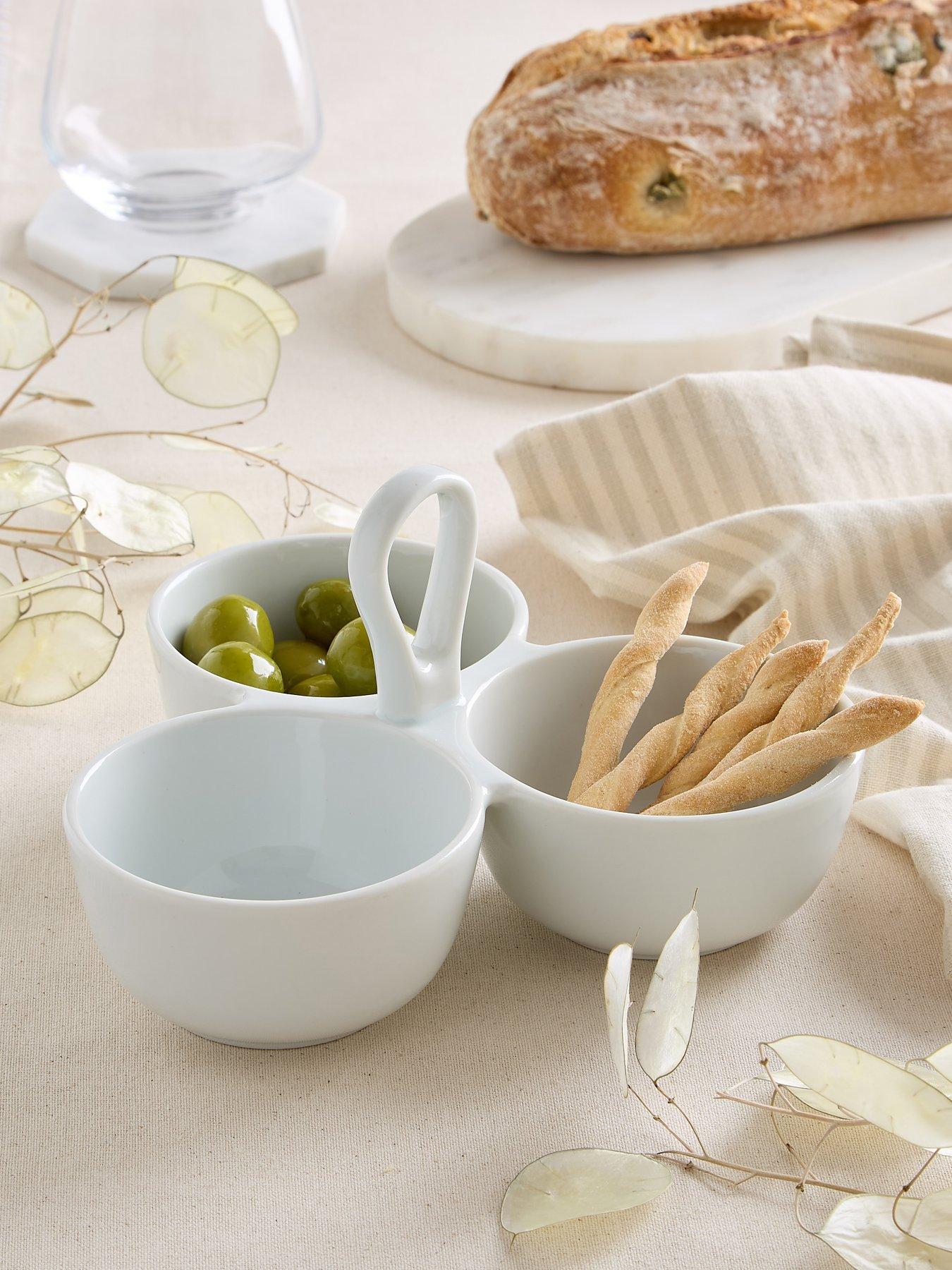 Waterside Trio Serving Bowl This trio serving bowl from Waterside is a serving centrepiece that's perfect for everyday meals, elegant dinner dates and gatherings with friends and family alike. Made from white porcelain, it sees a trio of bowls surrounding the carrying loop in the centre. This unique design means you can fill all three with sweets and treats for the kids, use it for salsa, guac and other dips, or simply serve up nuts and other nibbles when watching a film. Material Content: Porcelain
