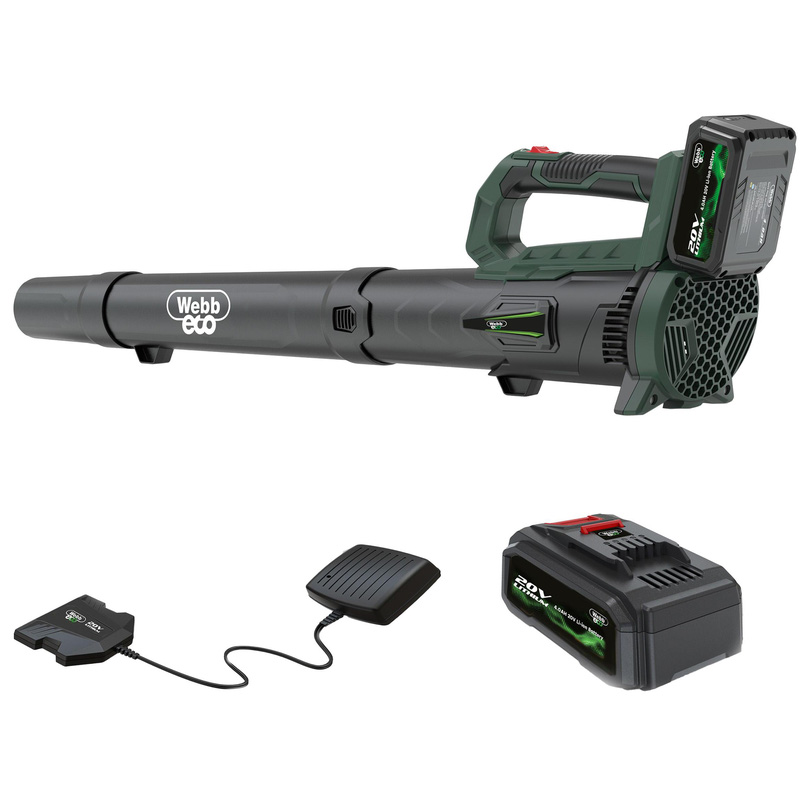 Clear leaves, debris and grass clippings efficiently with this compact and lightweight axial blower. Generating a maximum airflow of 475m³/h and speeds up to 100mph, it provides powerful gusts for effective cleaning in medium gardens. Driven by a reliable brushed motor and a 20V 4Ah battery, it delivers consistent performance with up to 19 minutes of cordless runtime. * 100mph max air speed – provides powerful gusts for effective debris removal * 475m³/h max air flow – clears leaves and grass clippings efficiently * Compact & lightweight design – ensures comfortable, hassle-free use * 20V cordless power – offers up to 19 minutes of continuous runtime * Includes battery and charger – comes with a 4Ah lithium-ion battery | Webb 20V 160mph Cordless Axial Blower 1 x 4.0Ah Battery & Charger in Black/Green