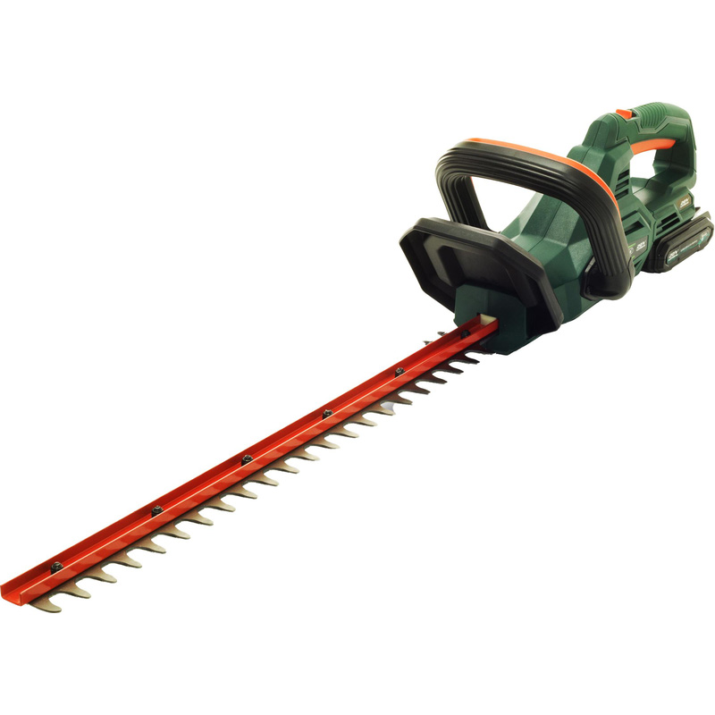Maintain medium gardens effortlessly with this powerful and efficient cordless hedge trimmer. The 50cm dual-action blades and 16mm teeth opening handle various hedge thicknesses with ease. Operating at a maximum speed of 1300 SPM, the reliable brushed motor ensures quick and precise trimming for a neat finish in less time. The 20V 2Ah battery provides up to 48 minutes of convenient cordless operation. * 50cm dual-action blades – ensure faster and more efficient trimming * Fast 1300 SPM cutting speed – delivers quick, precise results * 16mm teeth opening – handles various hedge thicknesses with ease * 20V cordless power – offers up to 48 minutes of runtime * Includes battery and charger – comes complete with a 2Ah lithium-ion battery | Webb 20V 50cm (20") Cordless Hedge Trimmer 1 x 2.0Ah Battery & Charger in Green/Red