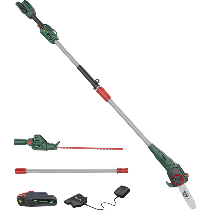 Enjoy versatile trimming and pruning capabilities with this multifunctional long-reach tool. The hedge trimmer attachment features a 50cm dual-action blade for fast, precise hedge shaping. Switch to the pruner attachment, boasting a 20cm bar and a 4.9m/s chain speed, for quick branch cutting. The pole attachment allows extended reach, while the automatic oiling system and tool-less chain tensioning ensure easy maintenance. * 2-in-1 functionality – combines a long-reach hedge trimmer and a pruner * 50cm hedge trimmer blade – delivers fast and efficient shaping * 20cm pruner bar – cuts through high branches cleanly and quickly * Extended reach pole – access tall hedges and limbs without a ladder * 20V cordless power – offers up to 40 minutes of runtime * Includes battery and charger – comes complete with a 2Ah lithium-ion battery | Webb 20V 50cm (20") Cordless Long Reach Hedge Trimmer & Pruner 1 x 2.0Ah Battery & Charger in Green/Silver