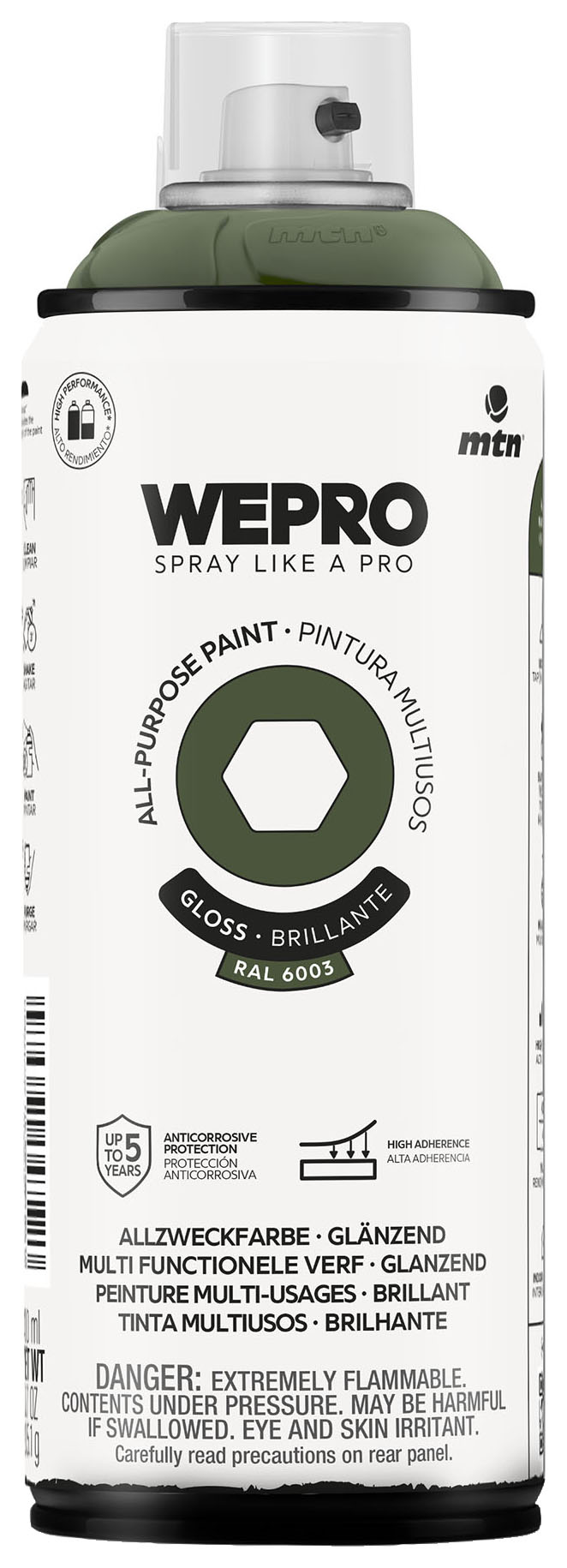 Wepro ALL-PURPOSE Gloss Spray Paint Rugby Green - 400ml - The MTN WEPRO All-purpose paint is a high-opacity spray paint designed to provide a perfect finish on a wide variety of surfaces. Thanks to its innovative technology, this paint guarantees an easy and effortless application. Its smooth valve and transversal cross diffuser cap ensure a uniform spray with no drips, preventing paint buildup and making the job easier. In addition, it offers superior adhesion on various surfaces. Its weather resistance includes anti-corrosive protection for up to 5 years, ensuring exceptional durability against the harshest conditions. With its high performance, just one spray of MTN WEPRO Multipurpose Paint allows you to paint much more, providing professional results and a uniform, long-lasting finish. Ideal for DIY projects, decoration, and maintenance.