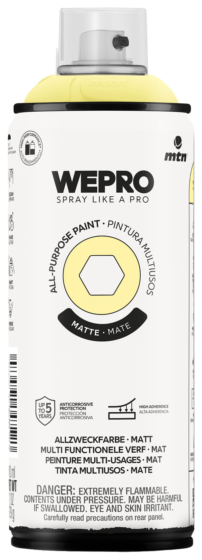 Wepro ALL-PURPOSE Matt Spray Paint Pisco Sour - 400ml - The MTN WEPRO All-purpose paint is a high-opacity spray paint designed to provide a perfect finish on a wide variety of surfaces. Thanks to its innovative technology, this paint guarantees an easy and effortless application. Its smooth valve and transversal cross diffuser cap ensure a uniform spray with no drips, preventing paint buildup and making the job easier. In addition, it offers superior adhesion on various surfaces. Its weather resistance includes anti-corrosive protection for up to 5 years, ensuring exceptional durability against the harshest conditions. With its high performance, just one spray of MTN WEPRO Multipurpose Paint allows you to paint much more, providing professional results and a uniform, long-lasting finish. Ideal for DIY projects, decoration, and maintenance.