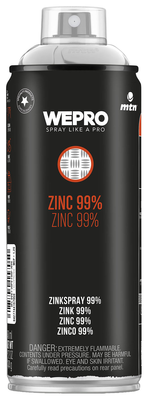Wepro Primer Spray Paint Pure Zinc 99 - 400ml - MTN WEPRO Zinc 99% is a fast drying zinc-rich primer with a matte appearance and characteristic zinc gray colour. Especially suitable for the protection against corrosion of metallic surfaces such as fences, tanks, weld joints, galvanized parts, industrial vehicles, coastal facilities, railway equipment, and so on.